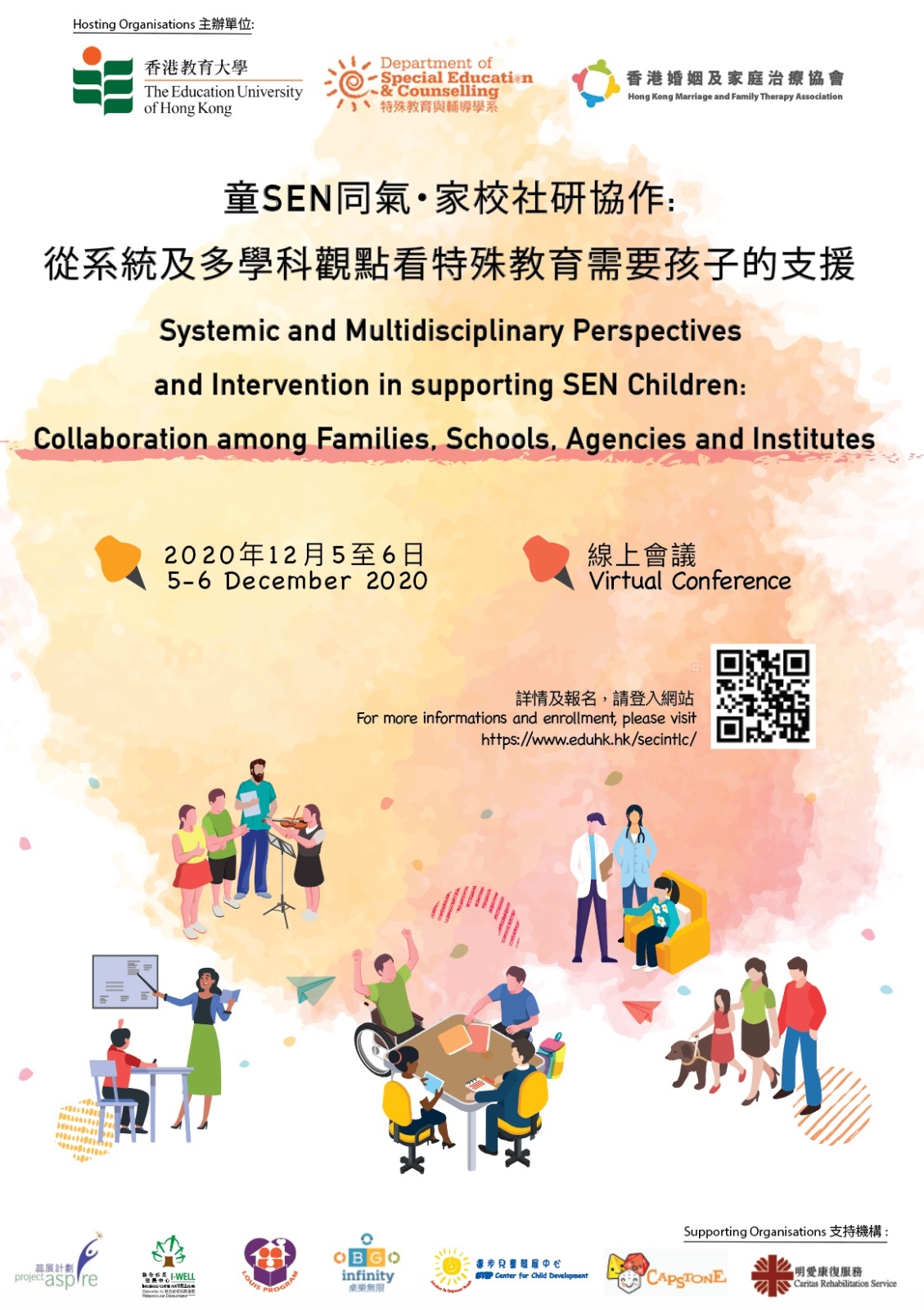 4.1 孩子的榜樣 – 如何有效地運用自身及坊間資源扶助自閉症譜系障礙學童的成長 4.2 電子個別學習計劃初探 – 如何在主流學校促進家校溝通及跨專業協作 4.3 揉合跨專業訓練元素於特殊學習需要之親子治療性小組中 4.4 育有特殊教育需要(SEN)或患自閉症譜系障礙(ASD)孩子的父母和他們的社會心理調適(包括功能和康健) |